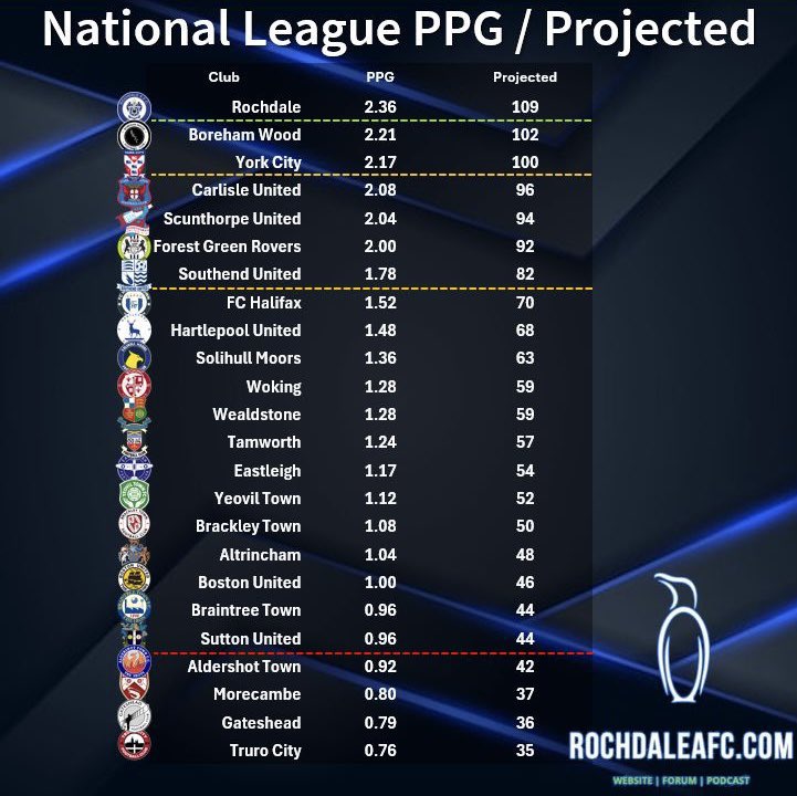 - Falling (3): Halifax and Gateshead might struggle to challenge for the play off positions again, both have lost key players (and Halifax a manager of 3 year's standing). Equally, Rochdale, despite some decent looking signings, might struggle as their EFL parachute payments tail off.